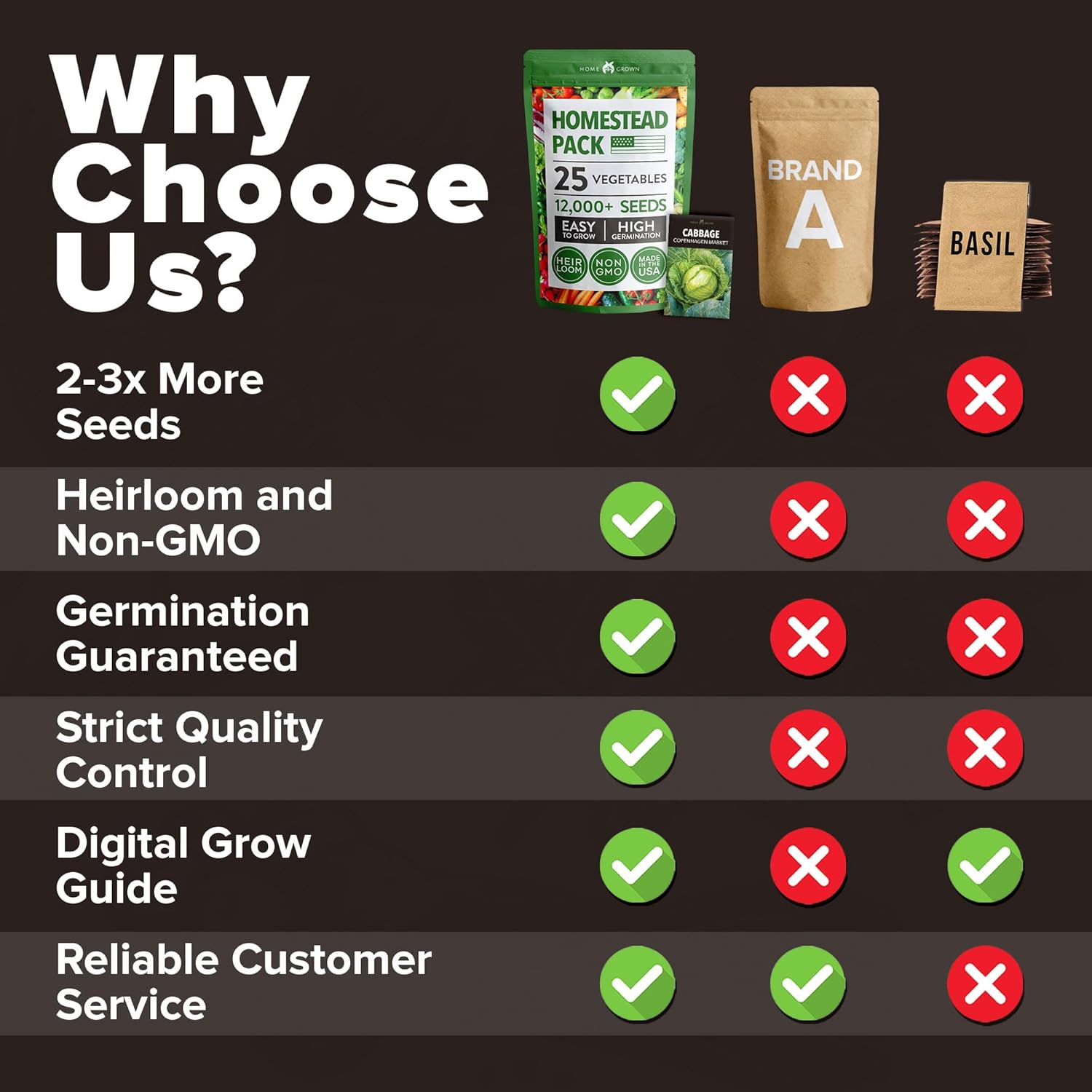 • 25 HEIRLOOM VARIETIES AND 12,000+ SEEDS FOR YEAR-ROUND HARVESTS. This comprehensive seed collection includes 25 traditional varieties and 12,000+ non-GMO seedsβ€”offering a continuous supply of robust, hardy vegetables that thrive in both hot and cold climates. Each variety was chosen for its flavor, productivity, resilience, resistance, growth cycle, and nutritional profile.
