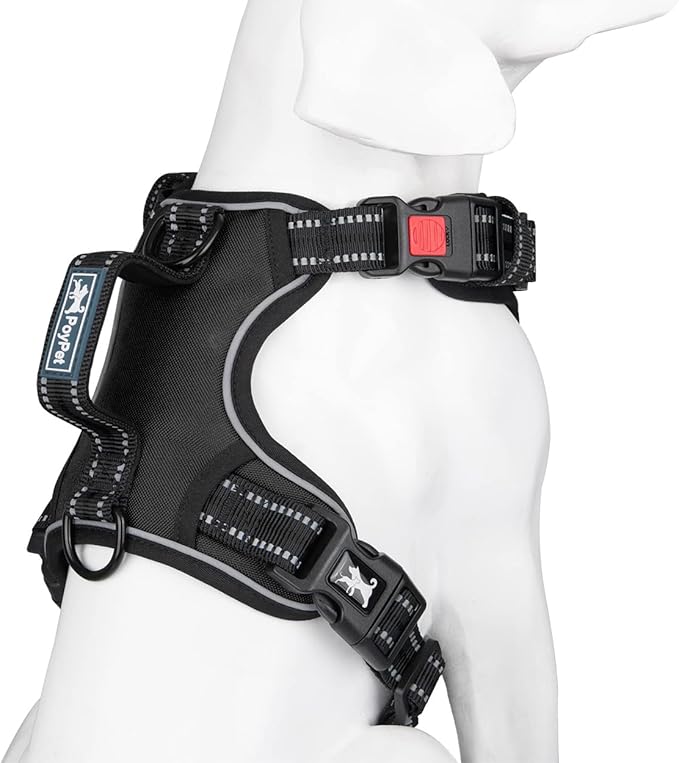 PoyPet No Pull Dog Harness, No Choke Front Clip Reflective Dog Vest with Soft Padded Vertical Handle, 3 Leash Attachments for Small Medium Large Dogs (Black,M)