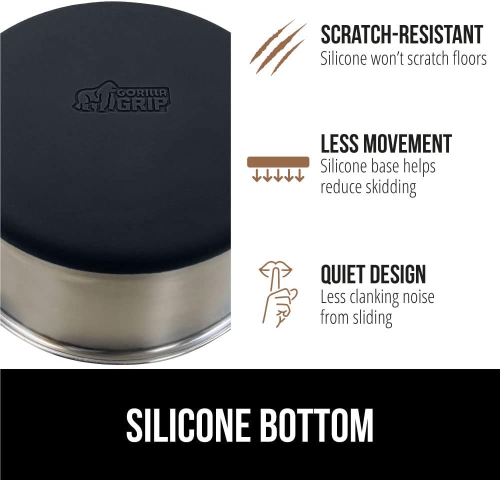 - SILICONE BOTTOM: the Gorilla Grip bowl is constructed from durable silicone that helps keep the bowl steady and wonβt scratch your floors; while some over eager eaters may still be able to slide the bowls, the silicone will help prevent much movement; plus, it reduces the noise from clanking and sliding across wood, tile, and more