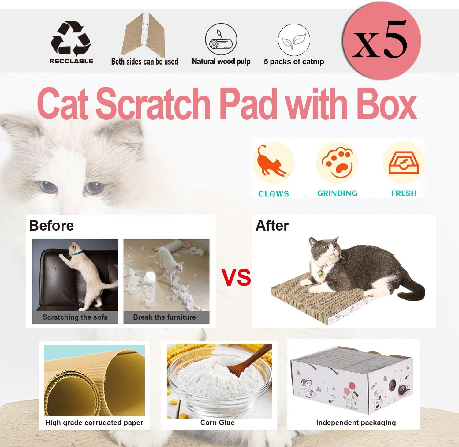 - 【Great Value】:The Scratcher Box is durable and 5 pieces Cat Scratching Pads are flipable use for better value