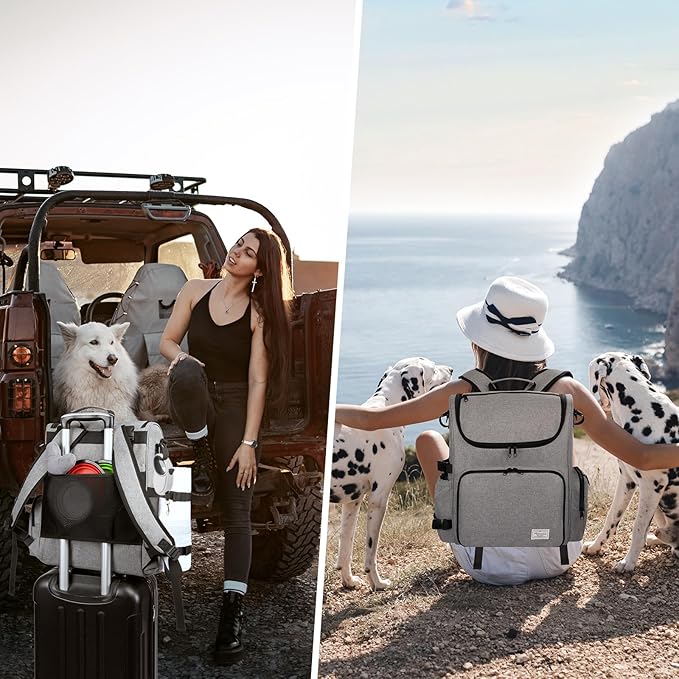 - MULTI-COMPARTMENT DOG TRAVEL BAG: This large dog backpack has a large inner compartment to store dog food, dog travel water dispenser, dog beach essentials and so on. The side pocket of this dog accessories backpack with zipper is for extracting tissue and dog poop bags. The top pocket on the dog travel bag is easy for you to hold your daily stuffs.The front pocket also folds down as a mat for easy and convenient pet feeding