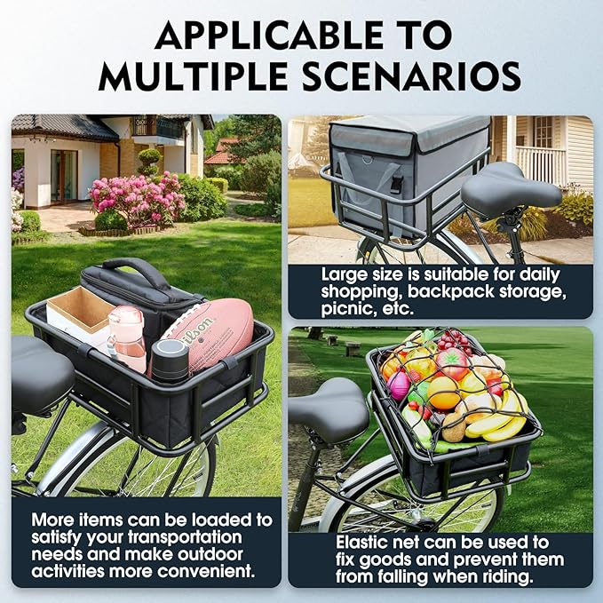 - 𝗘𝗮𝘀𝘆 𝗜𝗻𝘀𝘁𝗮𝗹𝗹𝗮𝘁𝗶𝗼𝗻:This bicycle basket is suitable for bicycles and electric bikes, it can be installed in only two steps, making it easy to install and remove.𝗧𝗼 𝗲𝗻𝘀𝘂𝗿𝗲 𝘁𝗵𝗲 𝗯𝗮𝘀𝗸𝗲𝘁 𝗳𝗶𝘁𝘀 𝘆𝗼𝘂𝗿 𝗿𝗲𝗮𝗿 𝗿𝗮𝗰𝗸,𝗽𝗹𝘀 𝗰𝗵𝗲𝗰𝗸 𝘁𝗵𝗲 𝘀𝗶𝘇𝗲 𝗰𝗮𝗿𝗲𝗳𝘂𝗹𝗹𝘆 𝗯𝗲𝗳𝗼𝗿𝗲 𝗼𝗿𝗱𝗲𝗿𝗶𝗻𝗴.