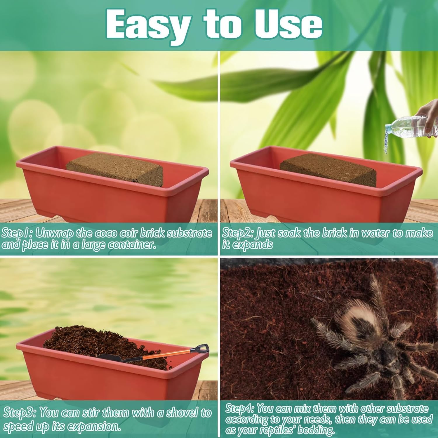 • Super Easy to Use & Store: Just soak the brick in water until it expands and re-constitutes. If it's too wet, let it dry a day or two before using it. The compressed coco coir brick substrate is lightweight, and after swelling with water the coconut coir brick can be bagged up like nutrient soil. NOT RECOMMENDED FOR BABY REPTILES DUE TO ACCIDENTAL SUBSTRATE SWALLOWING OR GETTING TRAPPED