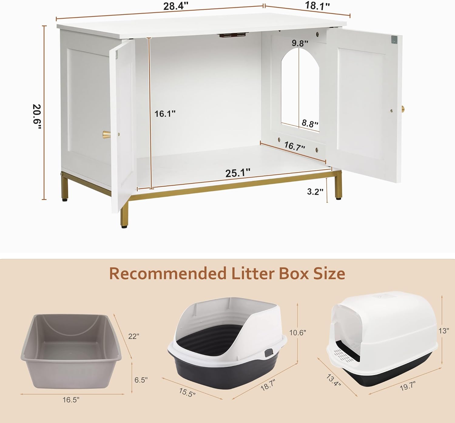 • Modern style: The cat litter box cabinet features white finish and metallic gold-colored metal frame, adding an elegant and stylish touch to your home decor. Its minimalist design and exquisite detailing inject a touch of luxury and sophistication into your living space