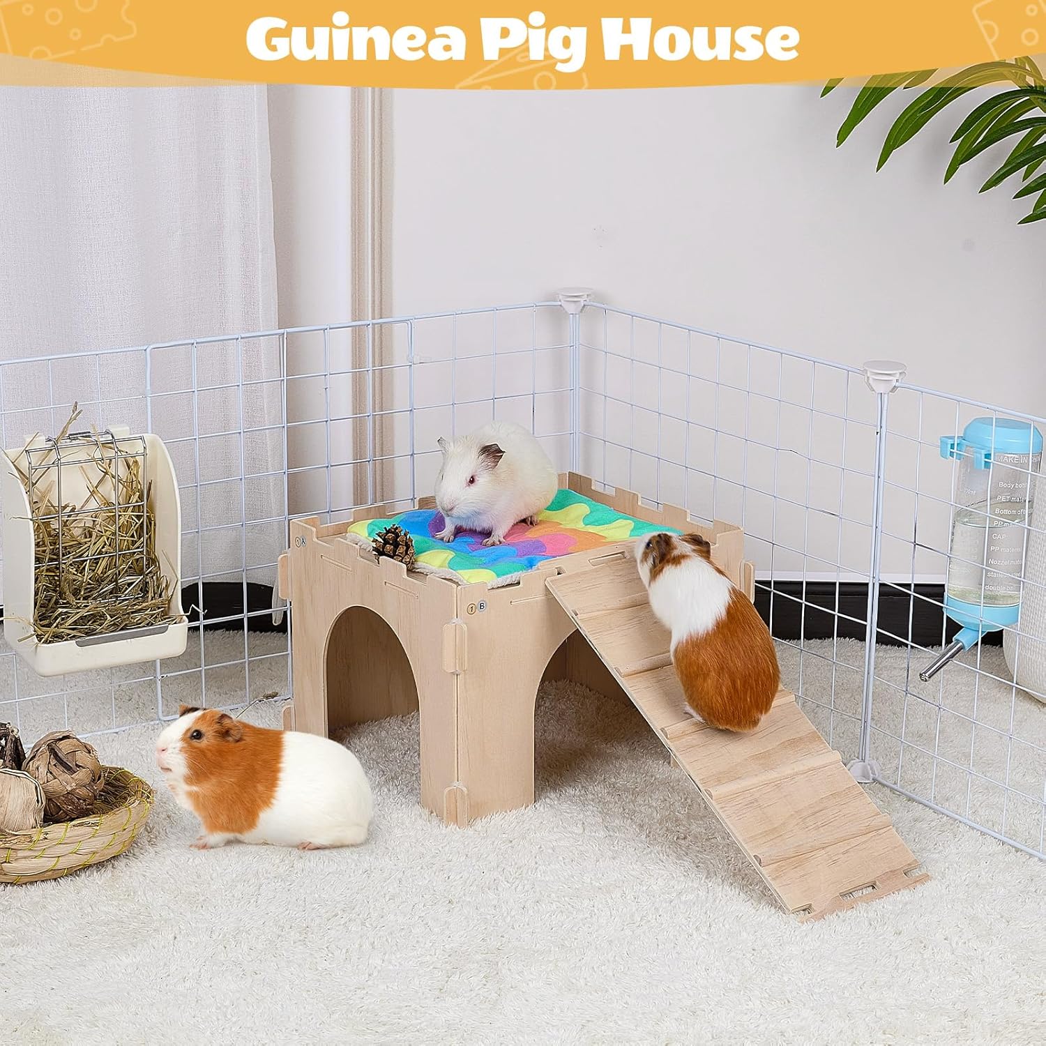 • Come with Guinea Pig Bed: This guinea pig hideout also comes with super absorbent mats that preserves the house or floor from animal urine and droppings; The changing pad is reusable and made of comfortable and soft fabric