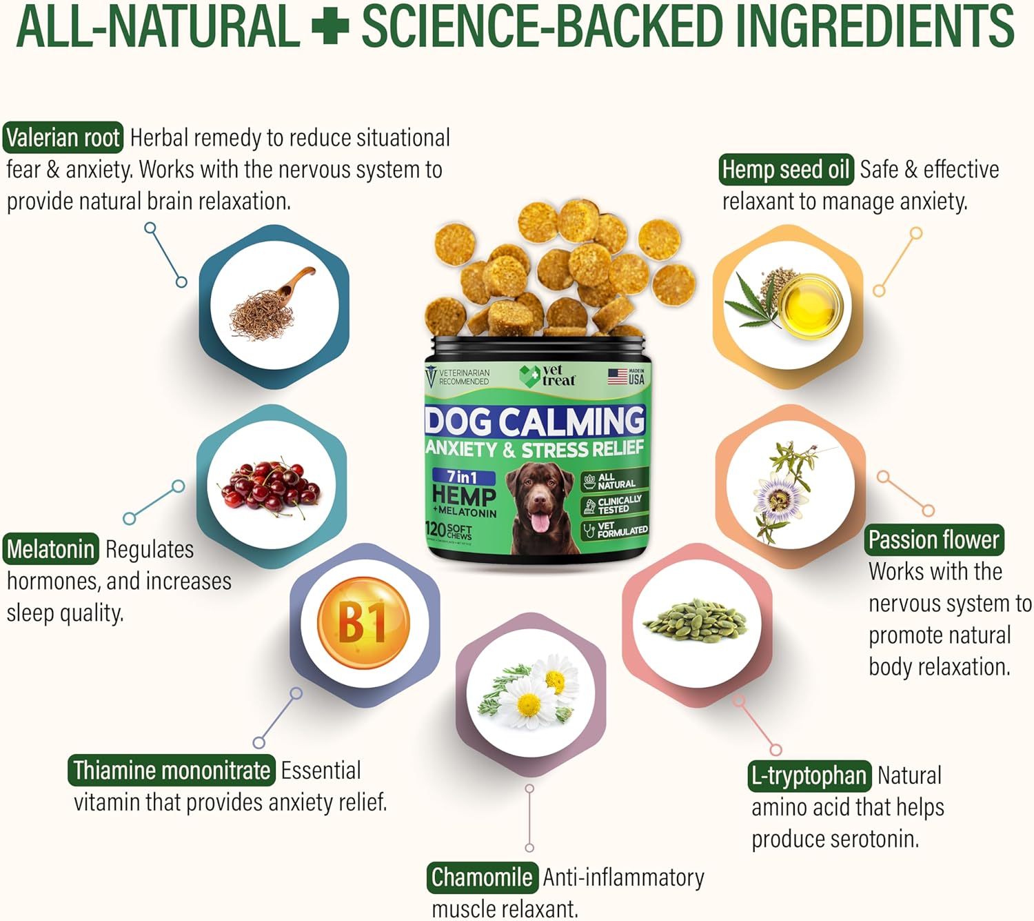 • Premium Natural Ingredients – Vet Formulated: Formulated by veterinarians, these dog calming chews - anxiety relief treats feature natural herbs and hemp for dogs to reduce anxiety and promote well-being – with no artificial fillers, corn, or soy.