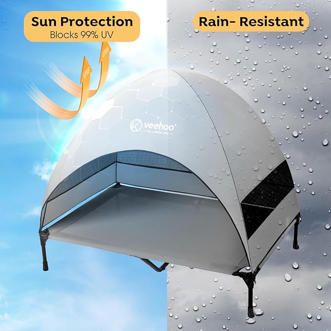Veehoo Outdoor Dog Bed with Canopy, Cooling Elevated Pet Cot with Removable Shade, Non-Slip Feet, Raised Dog Cot for Large Dogs, Pet Tent Bed for Camping, Beach, XLarge, Grey, CWC2411