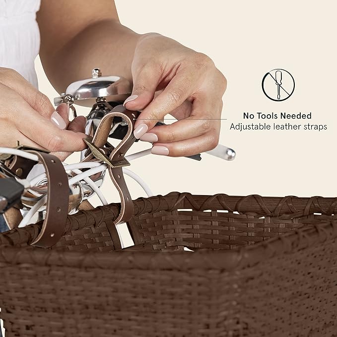 - Basket attaches to bike's front handlebars with adjustable leather straps and brass buckles, no tools required