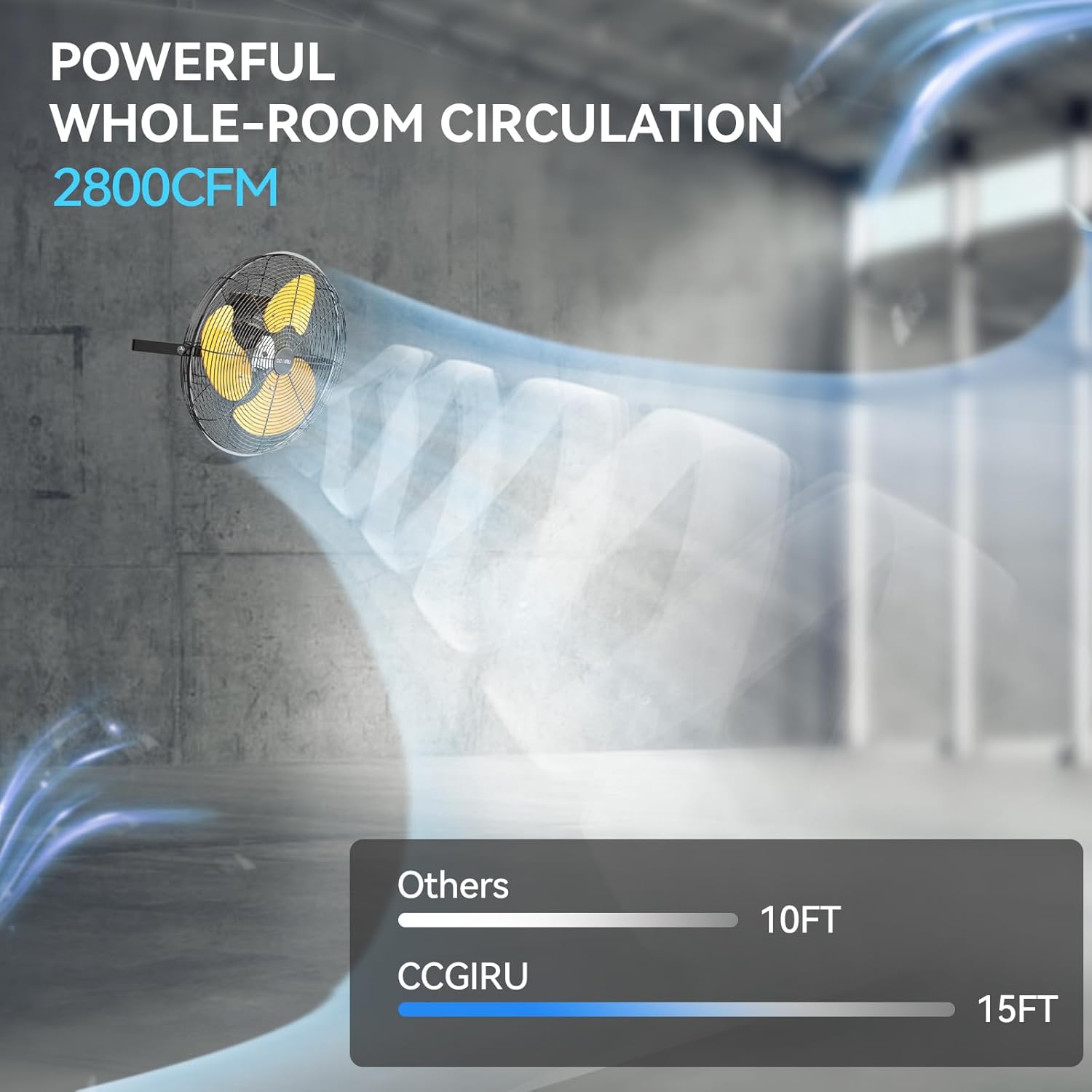 • Longer Airflow: Due to the new tech, CCGIRU's high-velocity industrial wall fan delivers longer airflow. In high speed, the blowing distance reach to 15 ft, the air speed even up to 28.21 ft/s