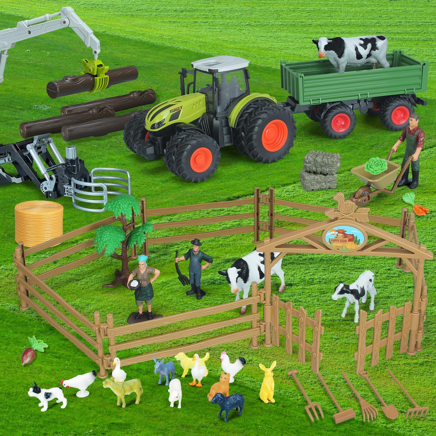 - 【46 Pcs Farm Toys Tractor】This tractor toys playset include 1 Friction Powered Tractor Vehicles, 1 Tractor Trailer, 1 Wooden Gripper, 1 Hay Bales Gripper, 7 Fence Set, 3 Farmer People Figures,1 Cart, 5 Farm Tools, 4 Log, 1 Round Bales, 2 bales of straw, 3 Vegetables, 1 Rock Pile, 1 Tree. And 2 cow and 12 livestock animals with realistic details and vivid colors. Kids would spend long hours exploring and building the farm animals world