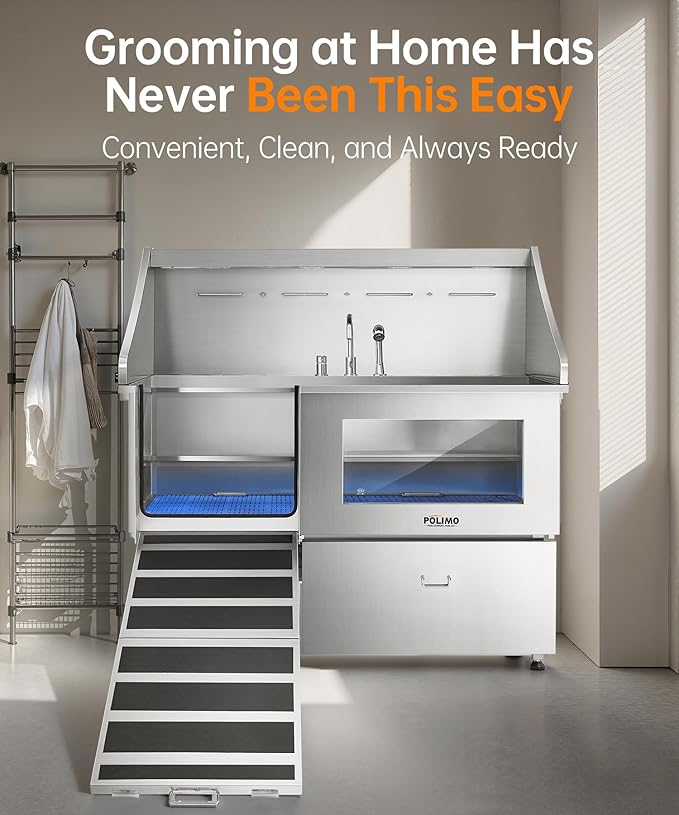 - Innovative and Practical Design: The POLIMO dog grooming station features multiple outstanding design elements: ①IP65 Waterproof high-brightness LED spotlight. ② Grade A tempered glass observation window. ③ The bathtub’s side panels feature a curved slide design, making it easier to operate④ Two-piece floor grid, adjustable to three different heights. ⑤ Sliding storage drawer for organized storage. ⑥ Multi-function faucet and showerhead, adjustable to left, center, or right positions.⑦ Two drainage options are available: one with a pet hair catcher and another stainless steel drain pipe featuring an odor-blocking S-trap design