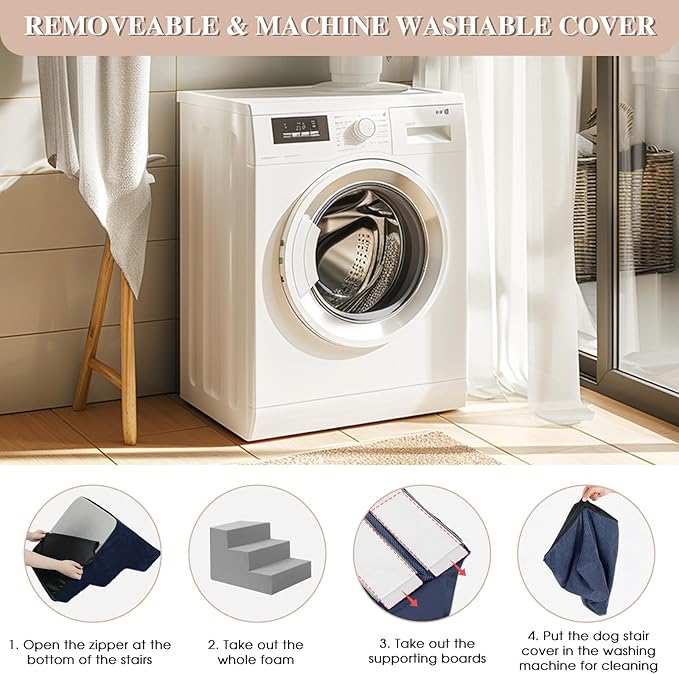 • 【ENHANCED STABILITY】GGIB dog stairs improve a new design with supporting boards, added between the foam stairs and the removable cover. They are fixed inside the cover. Pets can step on more stable and supportive stairs surface, preventing them from slipping when moving quickly.