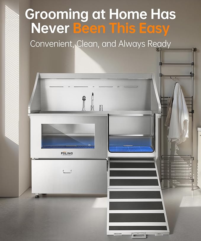 - Innovative and Practical Design: The POLIMO dog grooming station features multiple outstanding design elements: ①IP65 Waterproof high-brightness LED spotlight. ② Grade A tempered glass observation window. ③ The bathtub’s side panels feature a curved slide design, making it easier to operate④ Two-piece floor grid, adjustable to three different heights. ⑤ Sliding storage drawer for organized storage. ⑥ Multi-function faucet and showerhead, adjustable to left, center, or right positions.⑦ Two drainage options are available: one with a pet hair catcher and another stainless steel drain pipe featuring an odor-blocking S-trap design