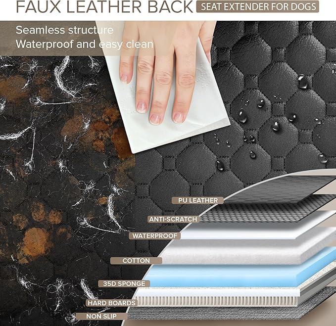 - Tripled Scratch resistant PU Leather truck backseat extender for dogs - Reinforced non-porous faux leather material make dog seat cover for back seat not only non-stick hair and waterproof but also 3 times more resistant to scratches than traditional fabrics. Truck dog seat cover back seat with faux leather layer distributes sharp impacts across a wider surface area, avoiding damage to car. Enjoy the dog hammock for truck that looks and feels luxury and durability