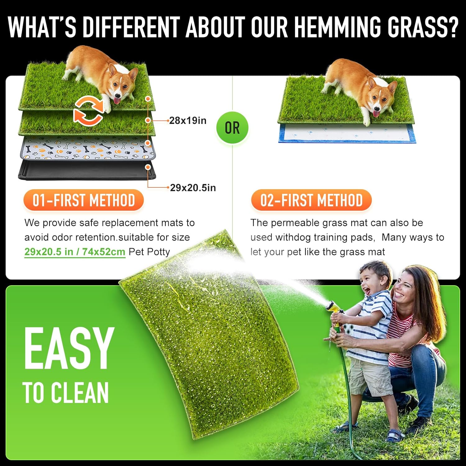 • REPLACEMENT SET】: The size of the dog grass pad is 28"×19", compatible with Hompet's pet potty tray ( 29"×20.5" ), realistic turf makes it easier to train your puppies, All training pads are hemming designed in order to prevent the turf from falling or being torn by dogs, there is no need to worry the grass mat will falling off like the other dog grass pee pads on the market and can't be used.