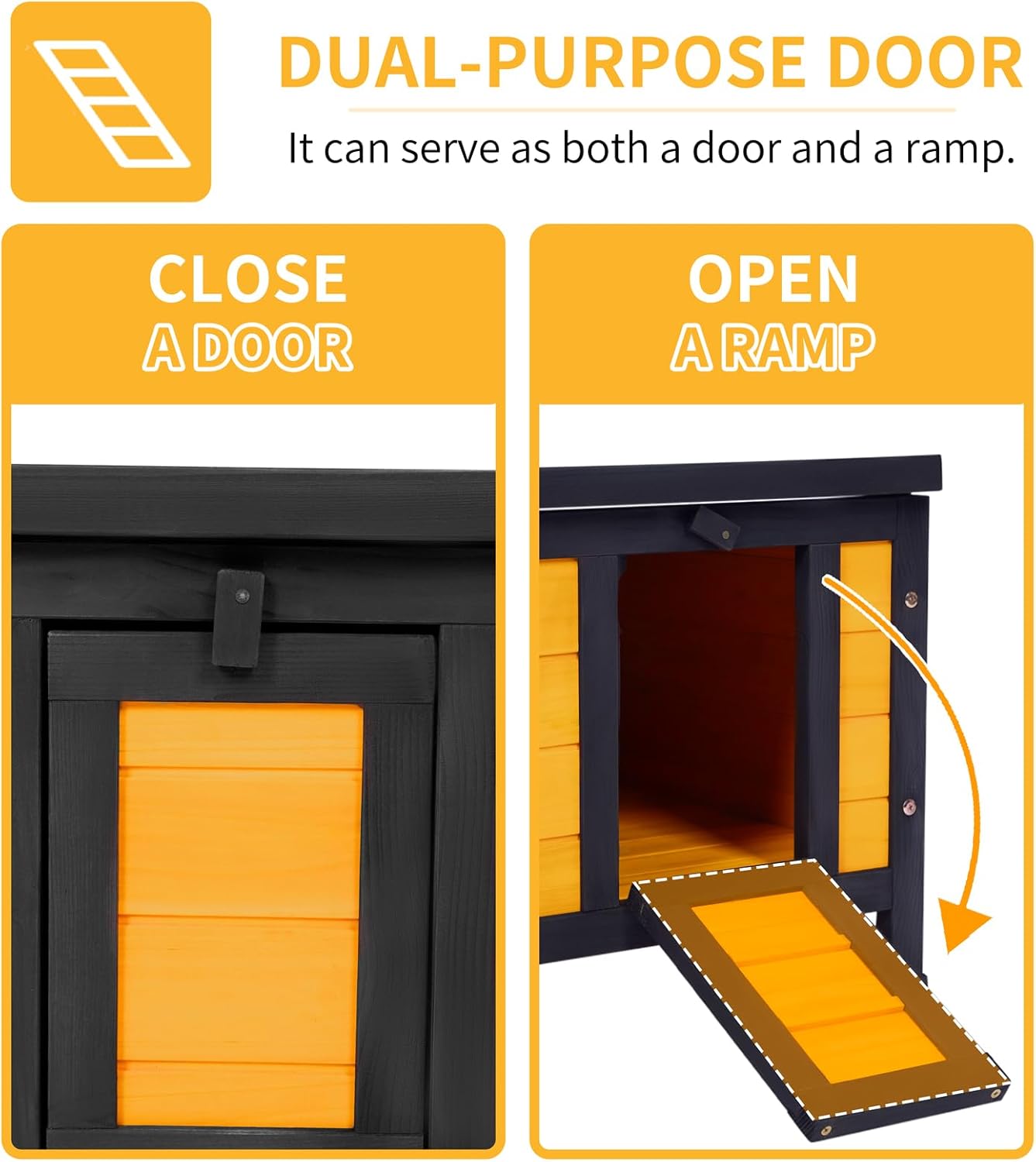 • 【Easy-Clean Rabbit Cage with Ramp Access】The outdoor cat house features convertible ramp door for elderly/small pets. Full-top opening and 19.5"D×16.5"W×16.9"H interior enables hassle-free cleaning. Wipeable surfaces simplify maintenance for rabbit cage indoor/outdoor use.