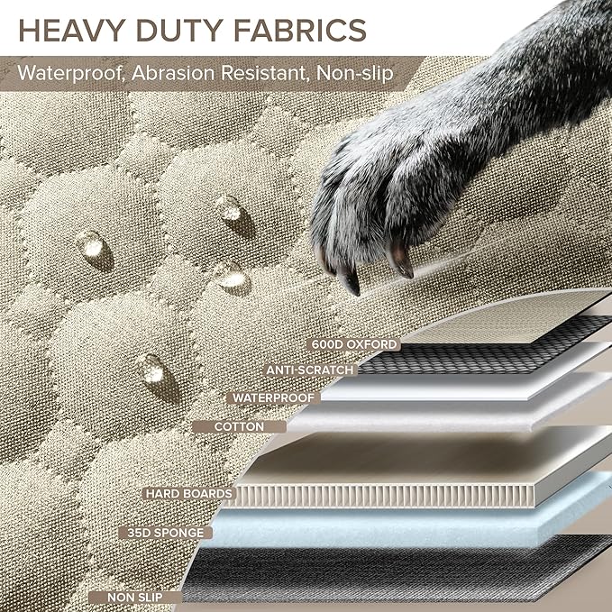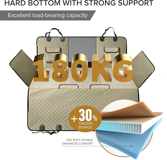 - 7-LAYERED CONSTRUCTION FOR SUPERIOR SUPPORT AND COMFORT - Crafted from durable materials 600D scratch-resistant Oxford cloth, waterproof fabric, reinforced hard bottom boards, 35D soft sponge, and cotton layers, this truck seat cover for dogs offers comfort and a non-slip surface. It shields your truck from damage, with an extra-high door flap to prevent scratches, allowing dogs to enter and exit without hassle