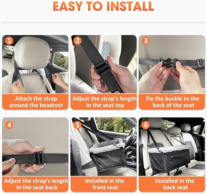 - πΆ[Easy to Install]: With its adjustable buckle design, the car seat for dogs can be easily installed. Simply attach the two straps around the headrest, fix the buckle to the back of the seat, and adjust the strap length as needed. It can be installed in both the front and back seats of your car, and it is compatible with most types of car seats and car models.