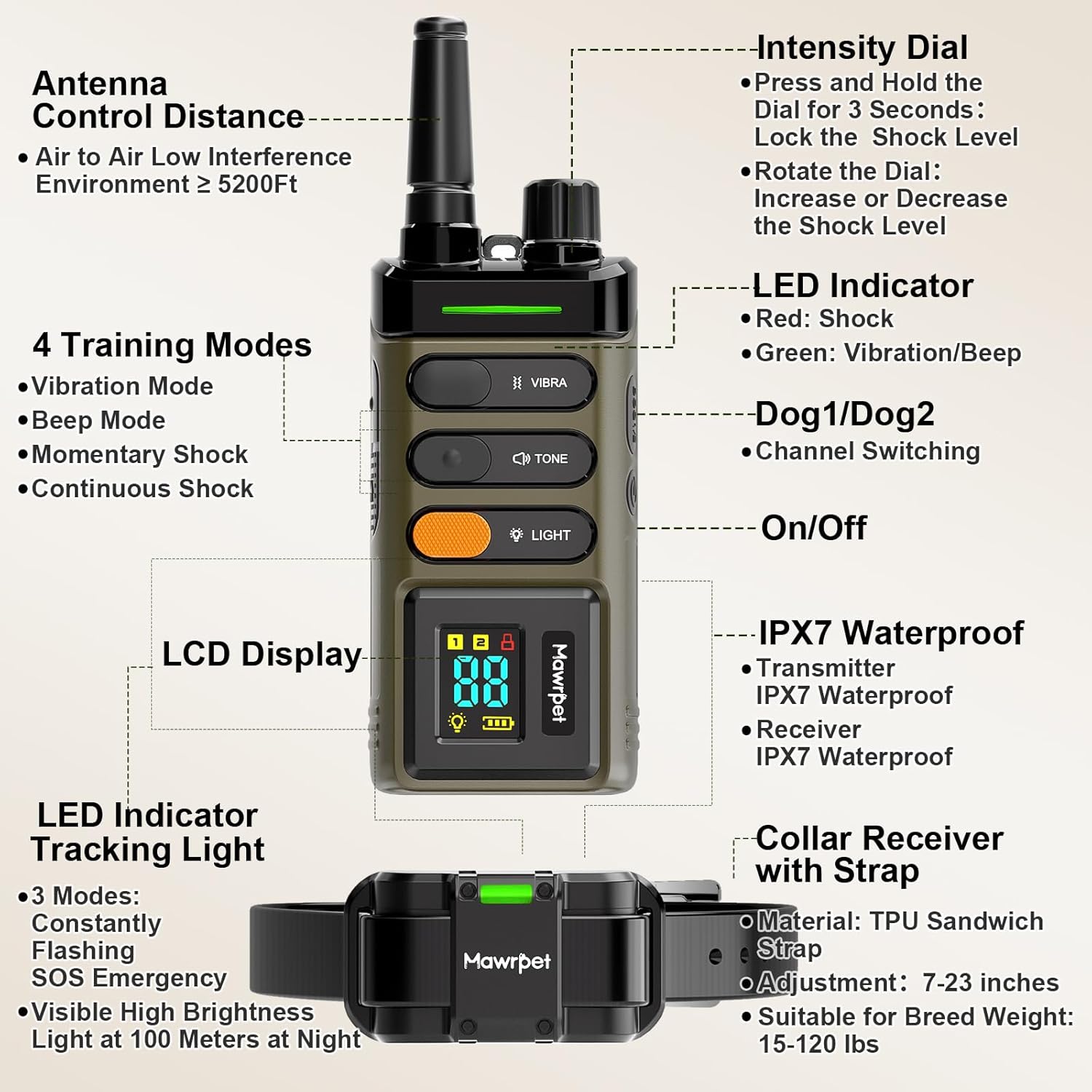 - 【IPX7 Waterproof Collar, IPX7 Waterproof Remote 】The Mawrpet dog training collar and remote are both IPX7 waterproof, allowing you to use them in any weather without worrying about rain.