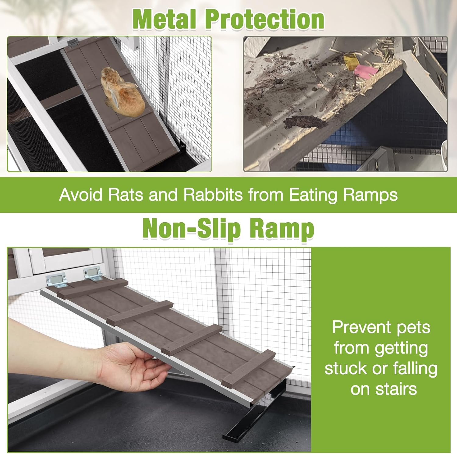 • Chew-Resistant Ramp Design: Our rabbit hutch's ramp has metal-edged corners to discourage chewing by rabbits and other small pets, enhancing the hutch’s long-term durability.This sturdy design protects against wear and tear, ensuring lasting use.