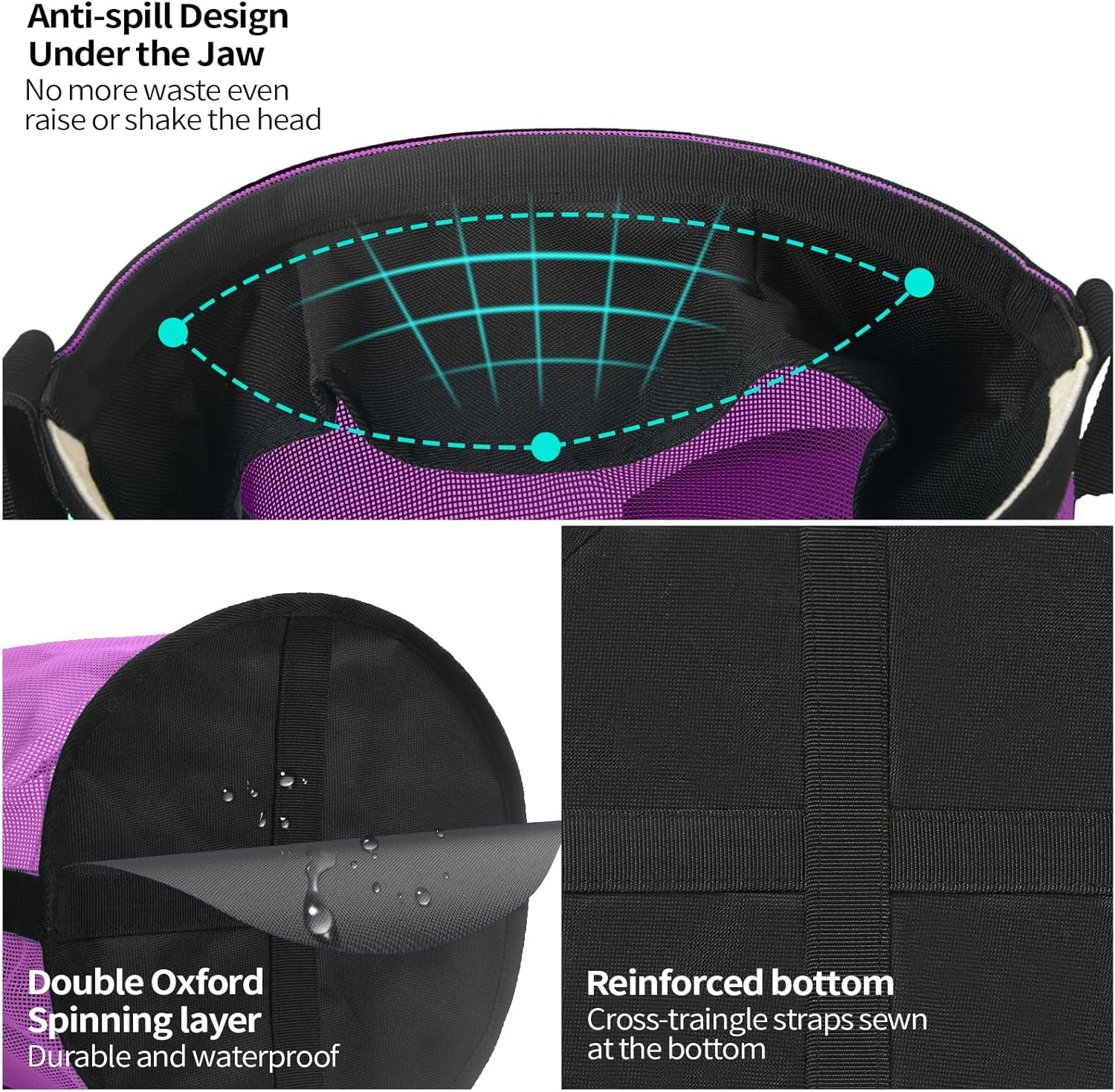 • ANTI-SPILL FLAP DESIGN: The solid flap under the jaw keeps feed in bag if horse has tendency to flip head while eating. No feed shake out even horses raising or shaking head. Save feeds that horses get the whole meal.