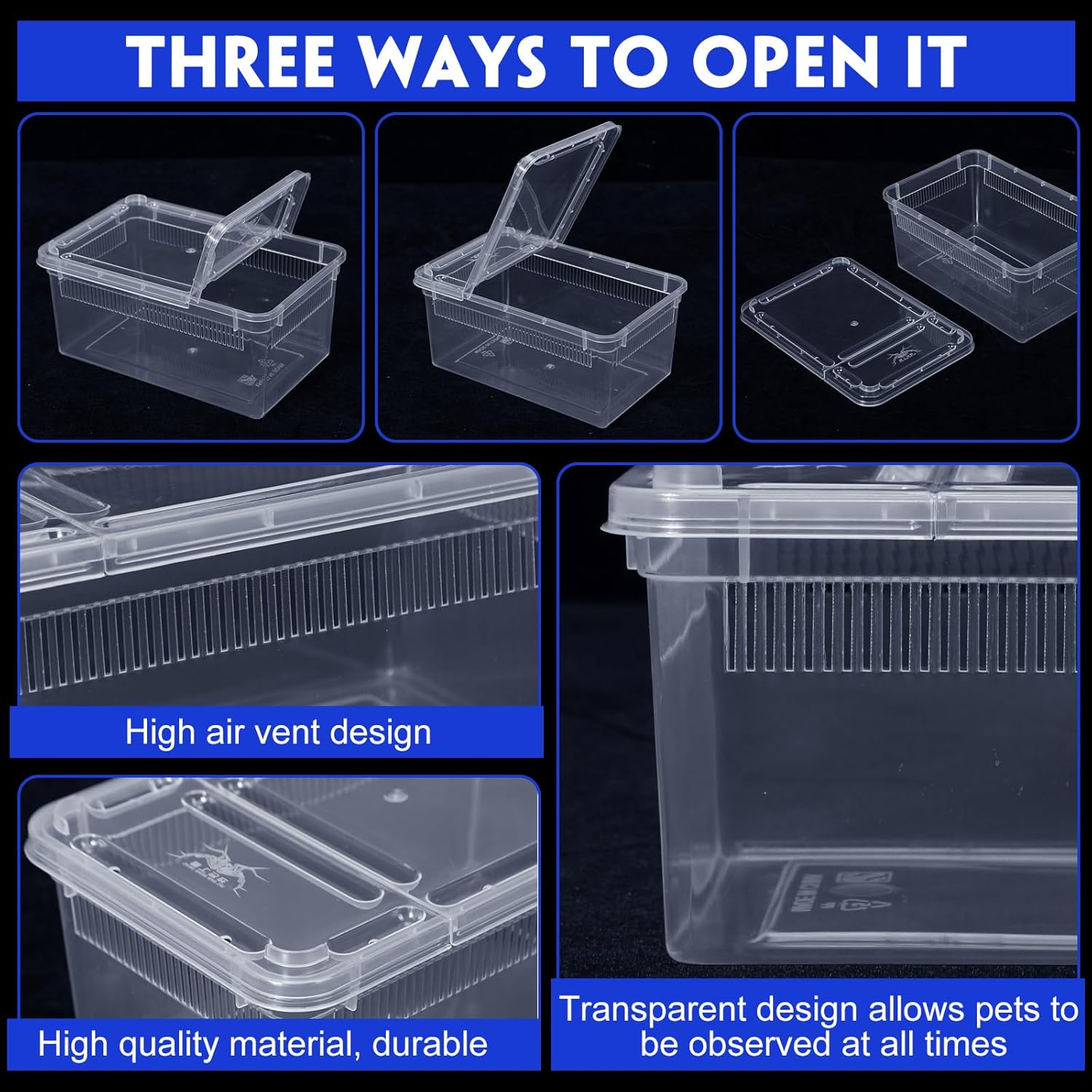 - Clever Design: this plastic terrarium is designed with multiple small air strips for ventilation, which not only ensures that crawling pets cannot escape the box, but also maintains the air circulation in the box; The double-opening design is convenient for raising pets or changing items in the box