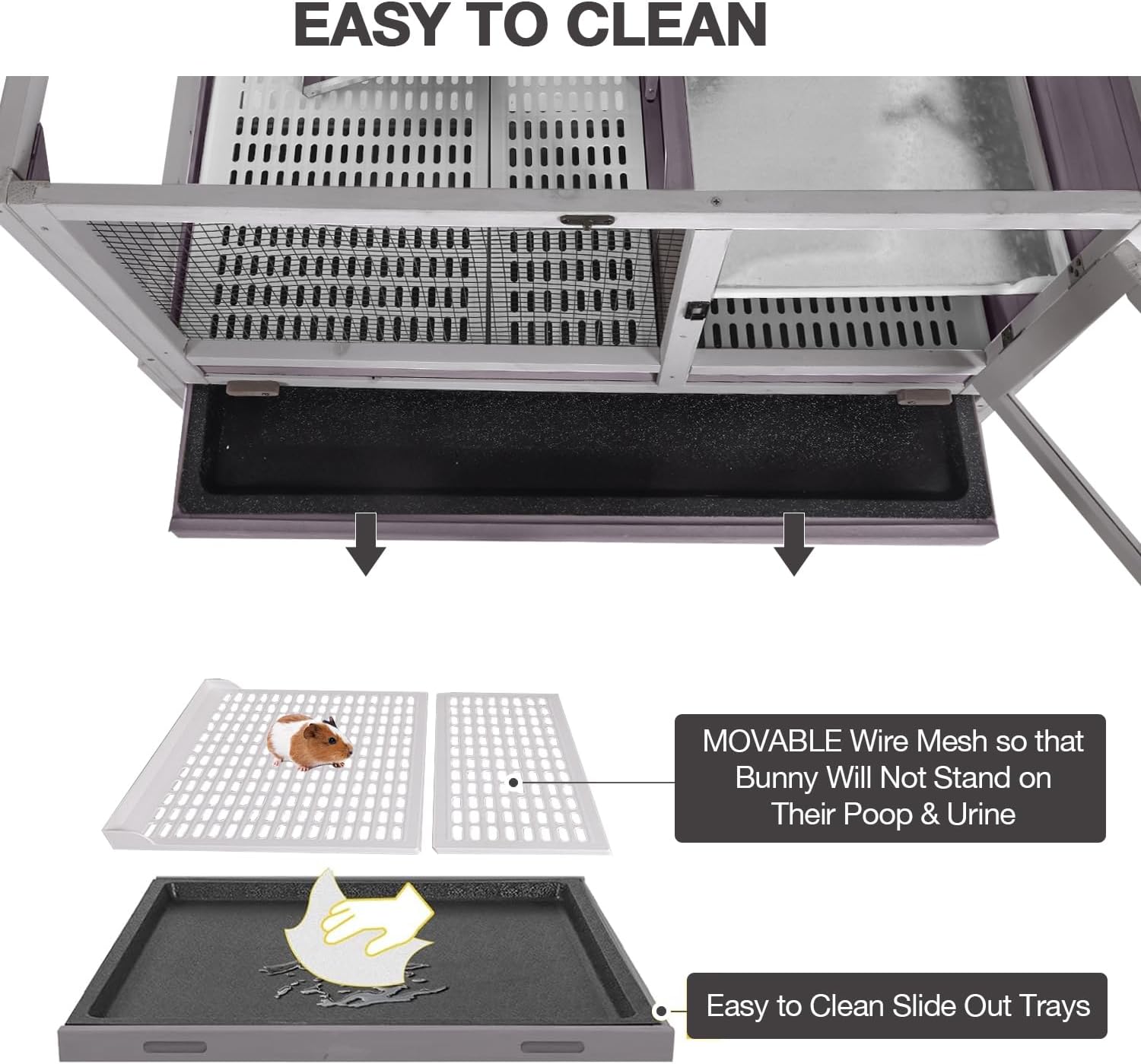 • EASY CLEAN WITH BOTTOM TRAY Our rabbit cage is equipped with a detachable leak-proof tray that can be easily pulled out to clean feces or bedding. There is a metal mesh to prevent rabbits from stepping on excrement. It is equipped with two wooden locks at the same time to prevent the pallet from sliding.Give your furry friend a clean and comfortable home