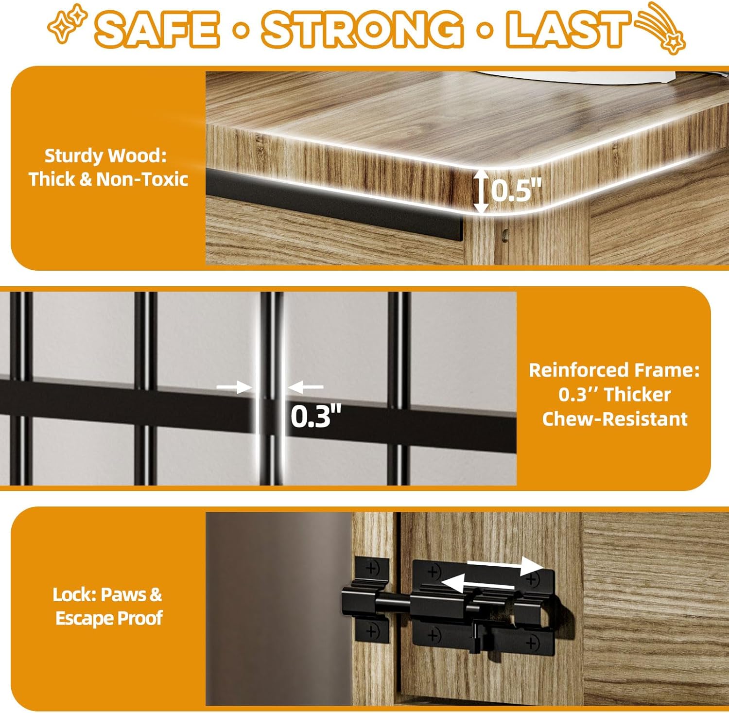 - Chew-Resistant & Durable Structure: Built with 0.3" reinforced steel bars and a 0.5" thick solid wood base. Supports long-term use without warping or breaking—even with energetic large dogs